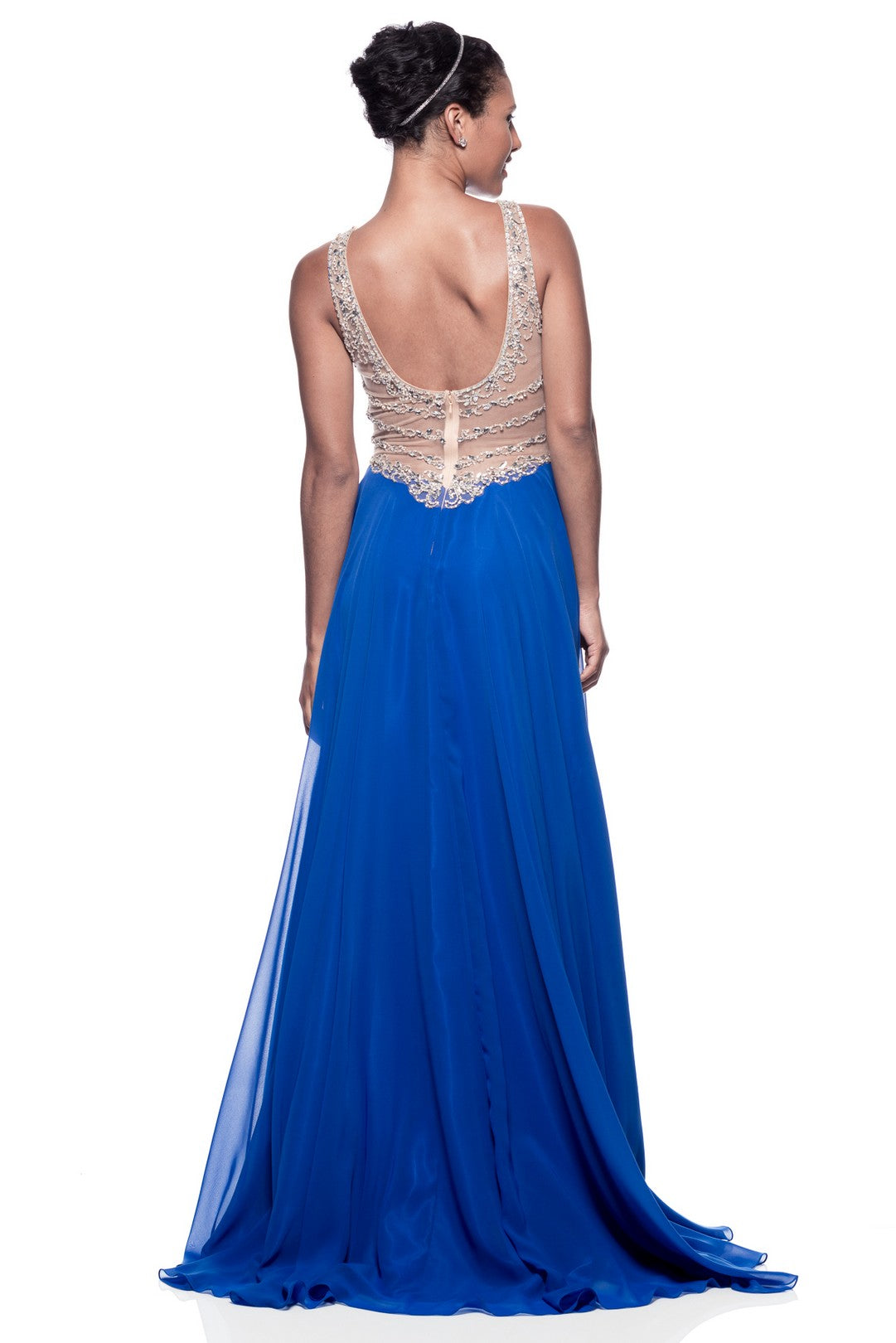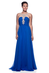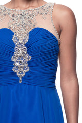 This dress features a sleeveless sheath style with a scoop neck, crafted from chiffon and adorned with crystals, beading, and sequins. It's perfect for evening events, black tie affairs, formal occasions, pageants, and proms.